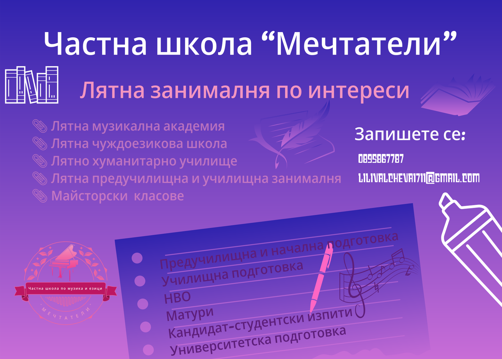 През летния сезон, Частна школа „Мечтатели“ предлага на вашето внимание разнообразие от дейности, обединени под името “Лятна занималня по интереси за мечтатели”, включваща в себе си: